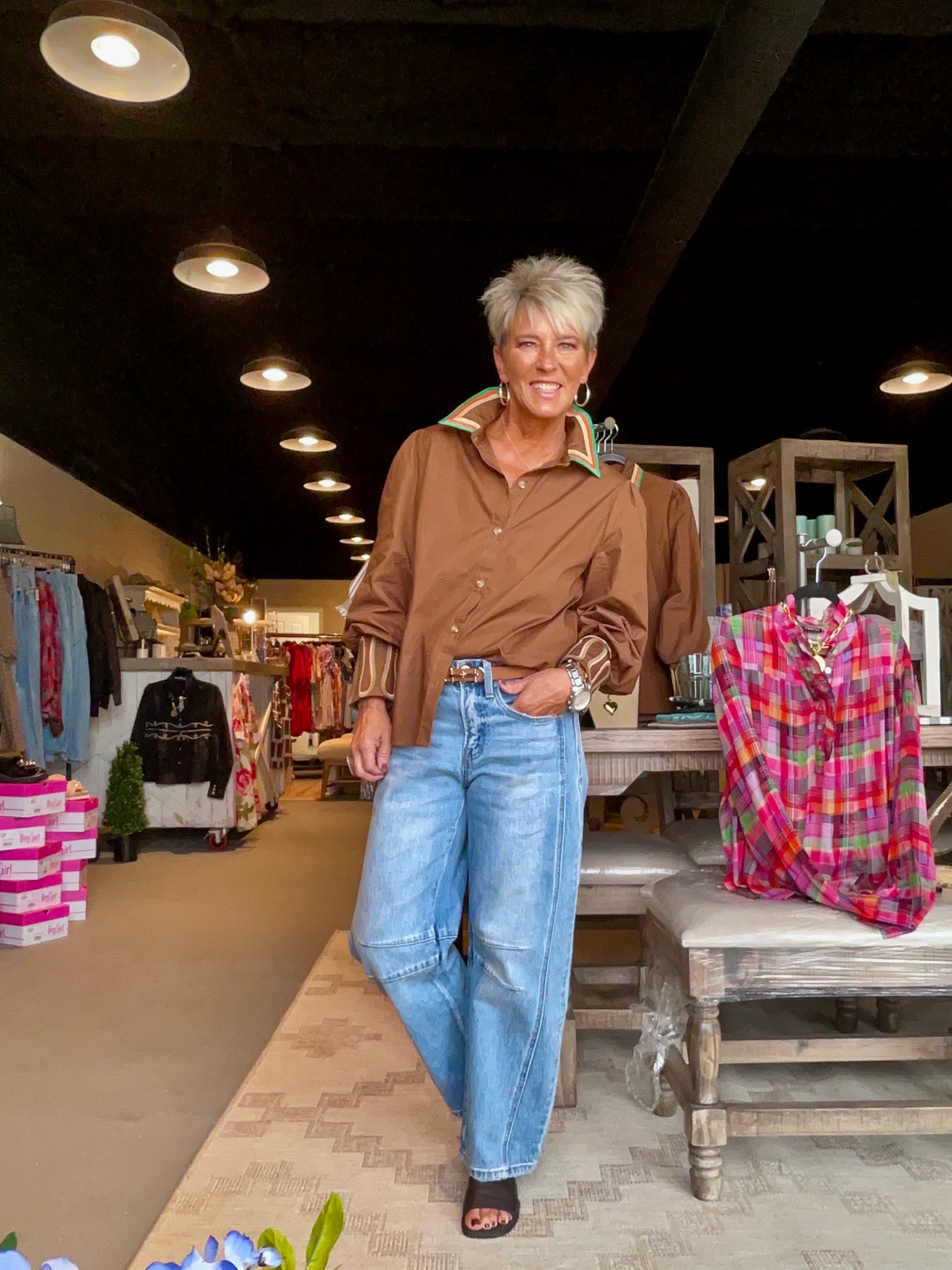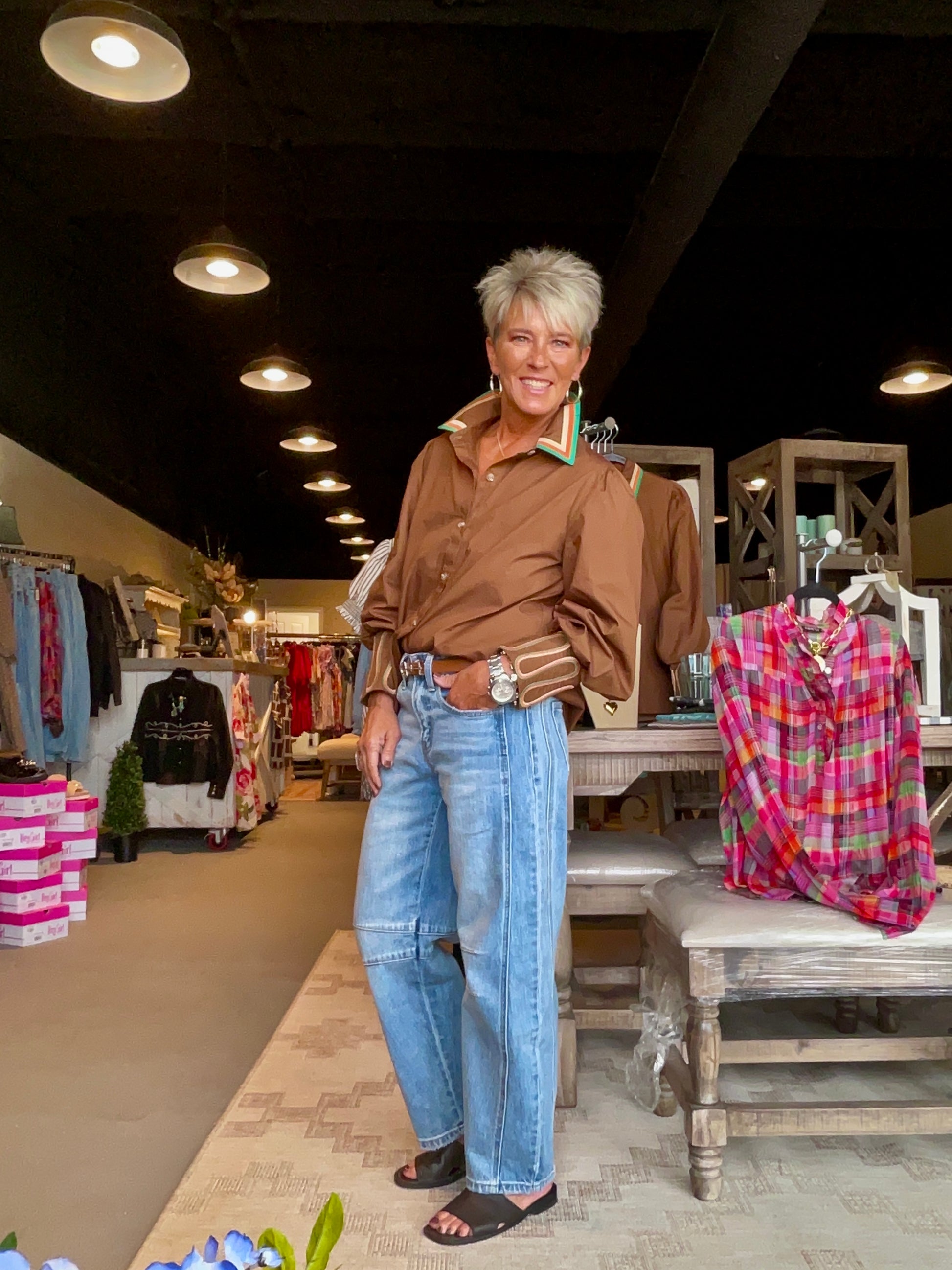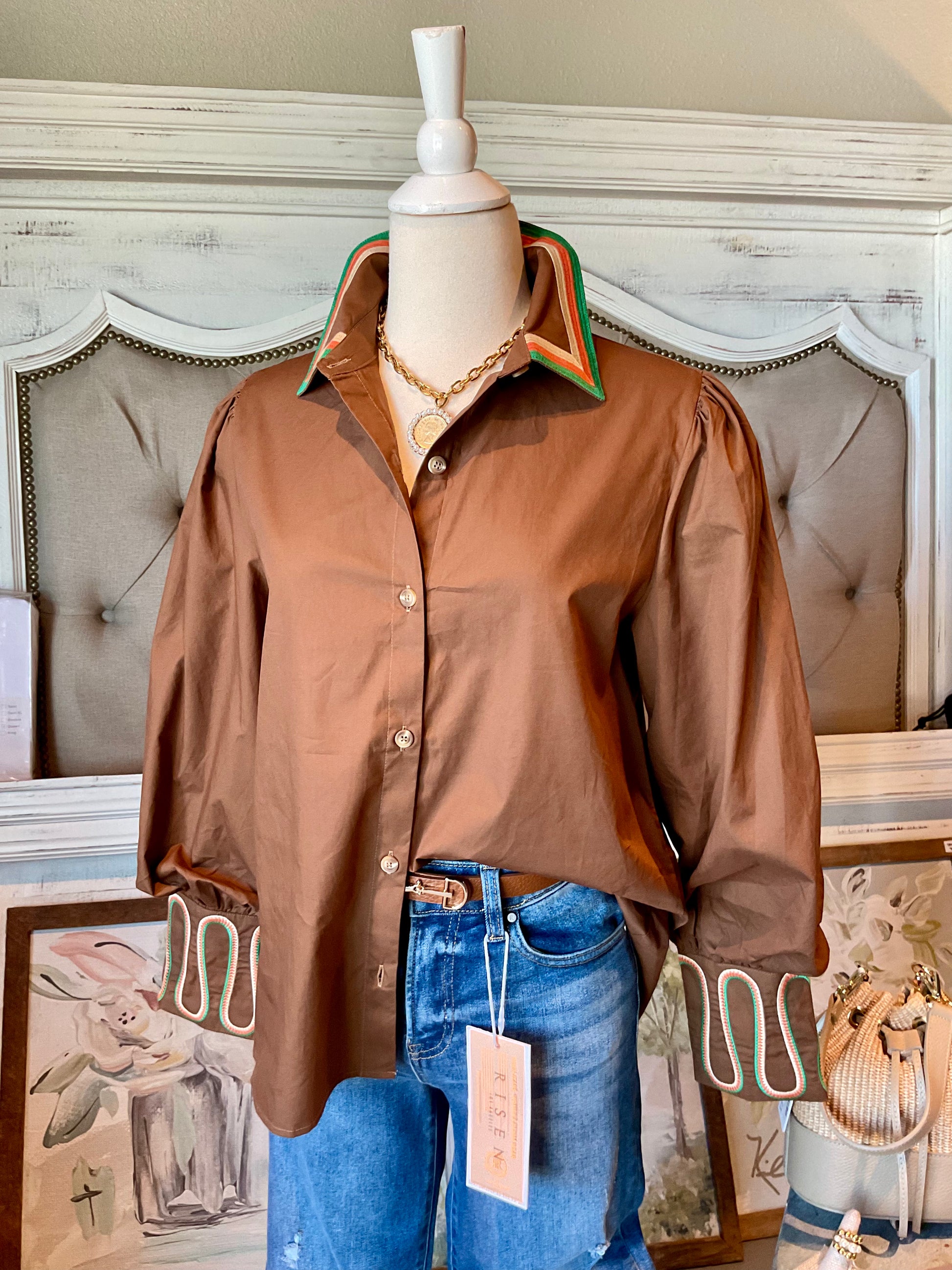 Brown Multi Trim Button down Top