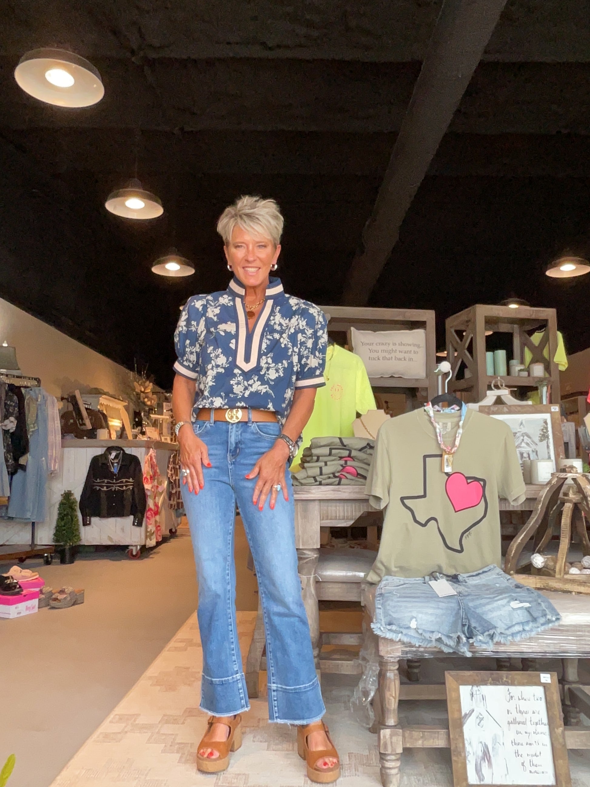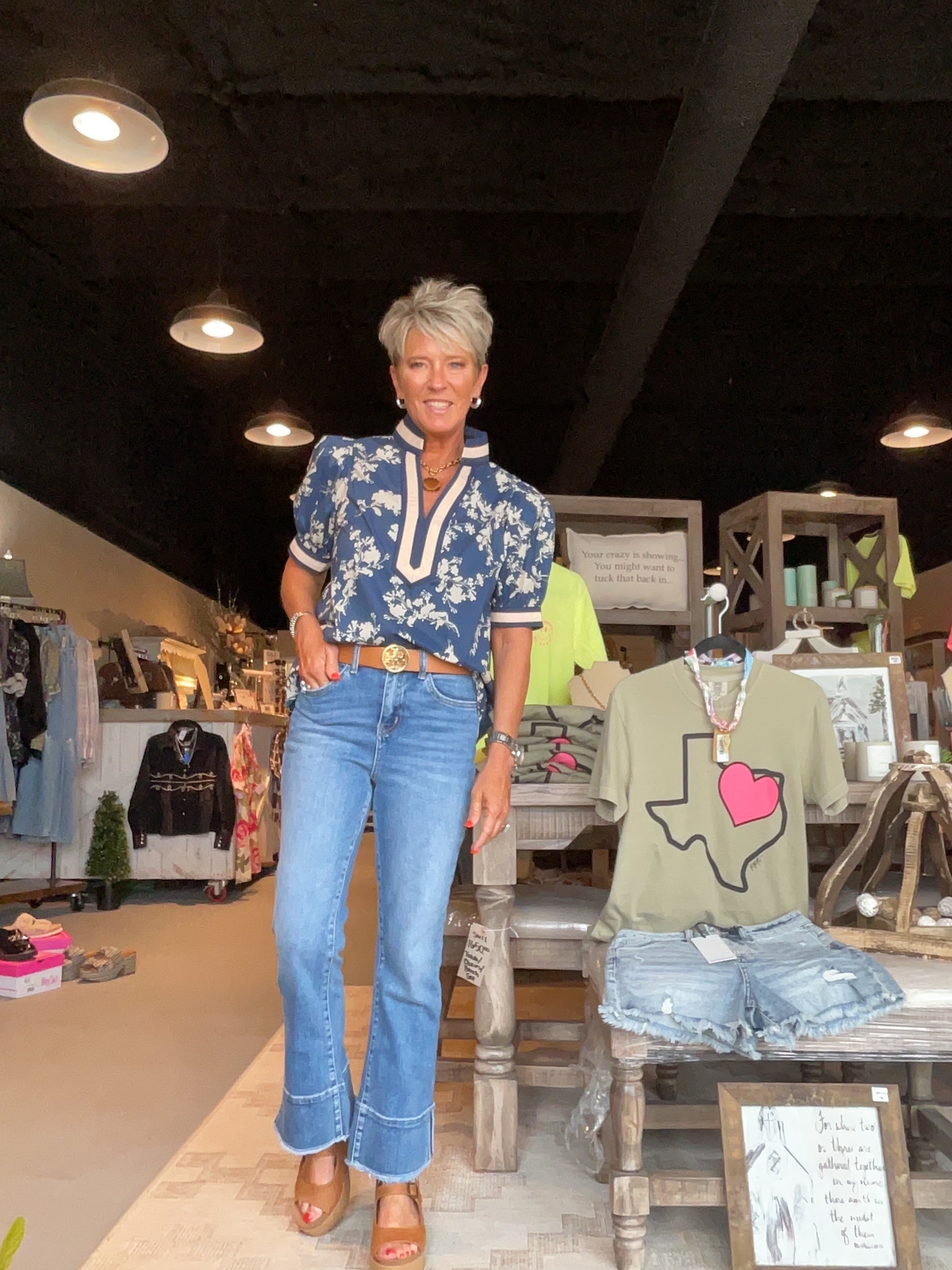 Midnight Blue Floral V-Neck Puff Sleeve Top with Striped Trim