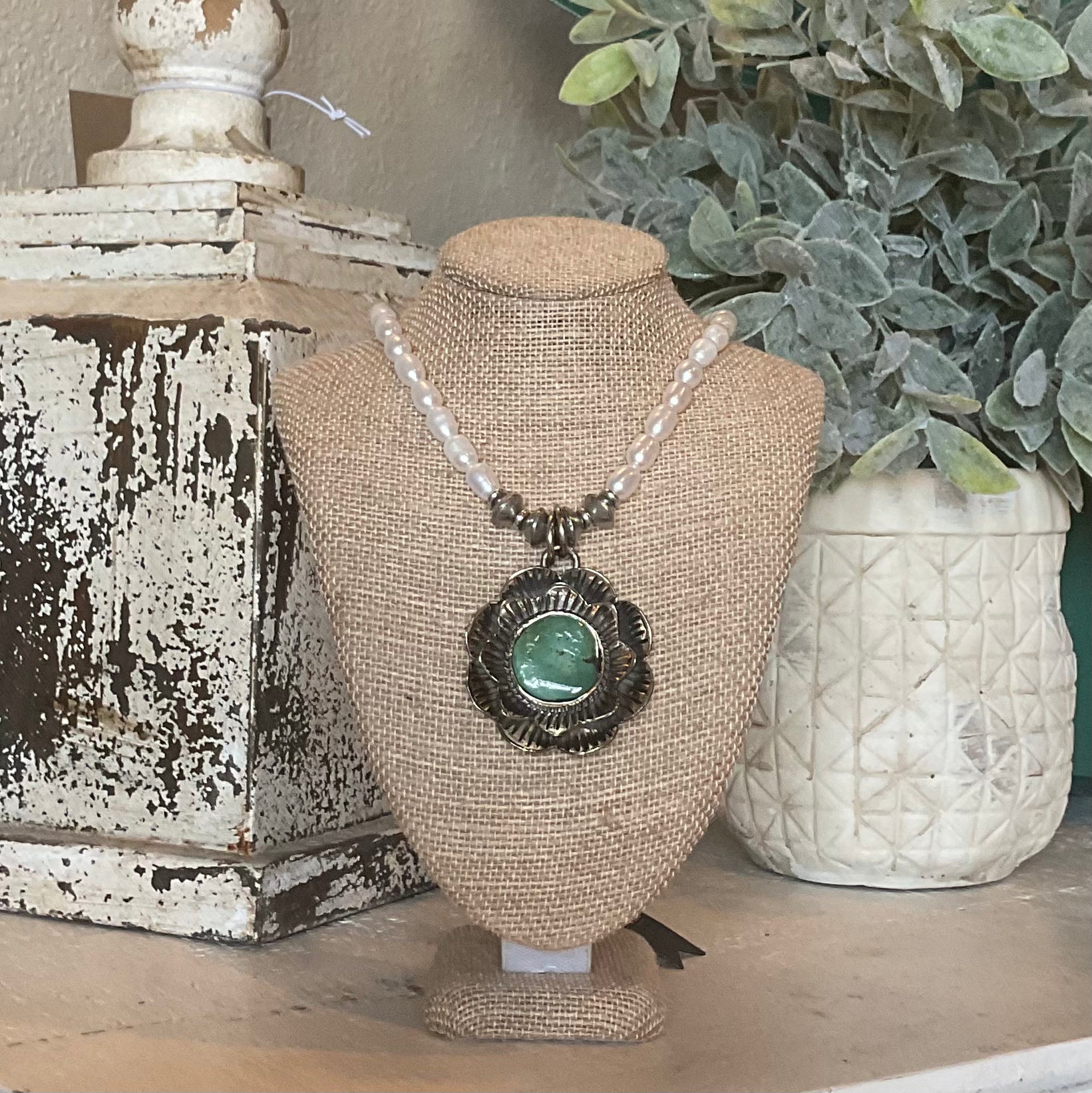 WJ01 Turquoise and Pearl Silver Blossom Necklace